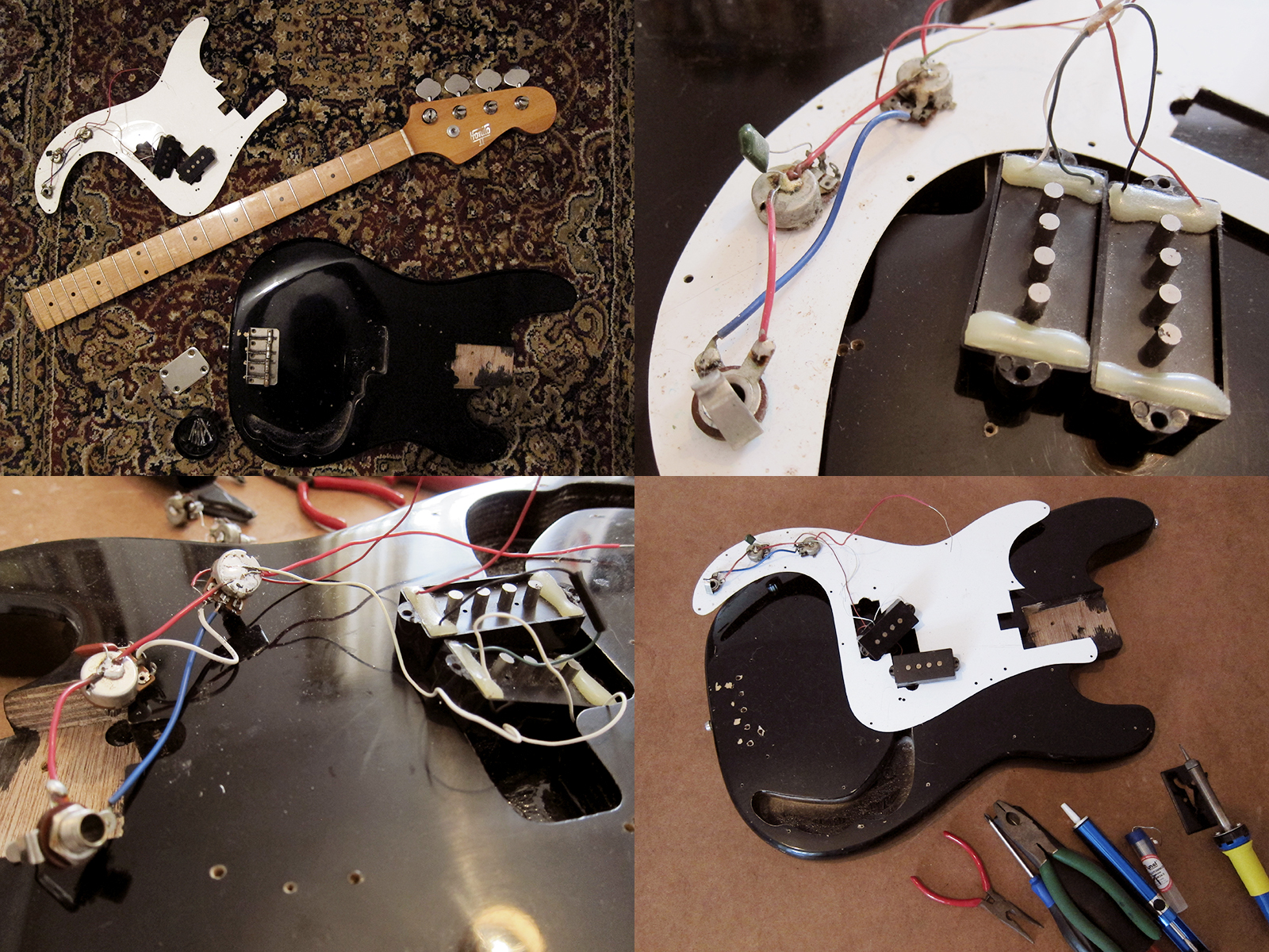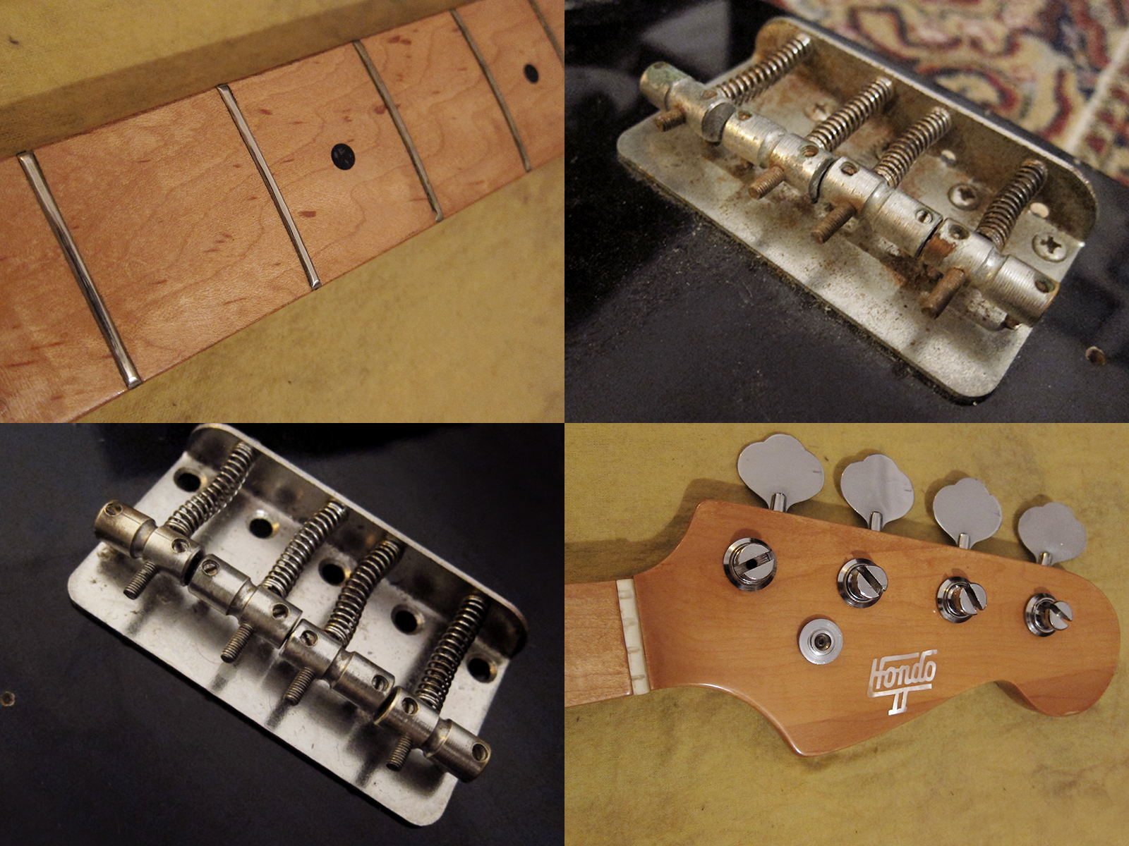The frets looked pretty bad so I masked the fretboard and polished them with 400 and 800 grit and then wire-wool. It looked like they had put the frets on before they applied lacquer to the neck and then after 35 years of playing half of it had worn off. The electronics seemed to be in good order and the guitar sounded awesome when I plugged it in so no reason to mess with that.