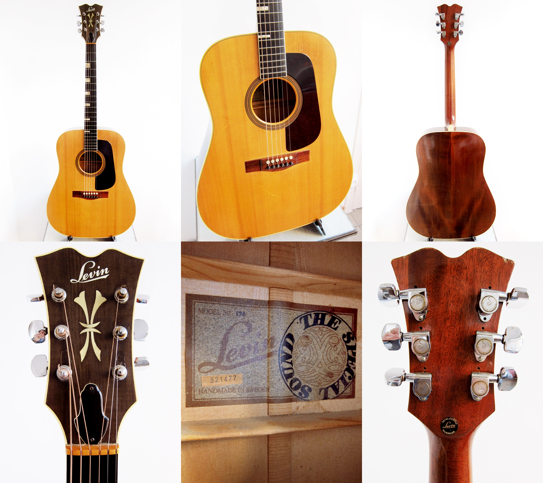 Finally, it took two years but now I’m at last the proud owner of a lovely Goya T-23. When I bought my first Levin back in the summer of 2013 I started to search Vintage Guitars Sweden for different models to study and learn everything I could about Levin. There was 3-4 different guitars that I fell in love with straight away, Levin LM-50 with all it’s bling, Levin De Luxe the king of archtops, Levin 174 which I later found, and of course Levin LT-23, the cowboy version of Levin LT-18. I love my 1966 Goya T-18 so I was pretty sure that this Goya T-23 would sound pretty sweet too, but it sounds even better than I could have imagined. My friend Wolf and I had a little jam last Saturday and it seems like the T-18 and T-23 were made to be played together, I will try to sort a video. I love everything about this guitar, the ebony fretboard with it’s block inlays, the flamed maple back and sides, the amazing cowboy pickguard and plastic details, the bridge shape and most of all, the sound. It has a Gibson like bass response but with a Martin like mid and treble, kind of the best of both worlds. It was well worth the wait, the next holy grail to find would be a Levin LM-50.