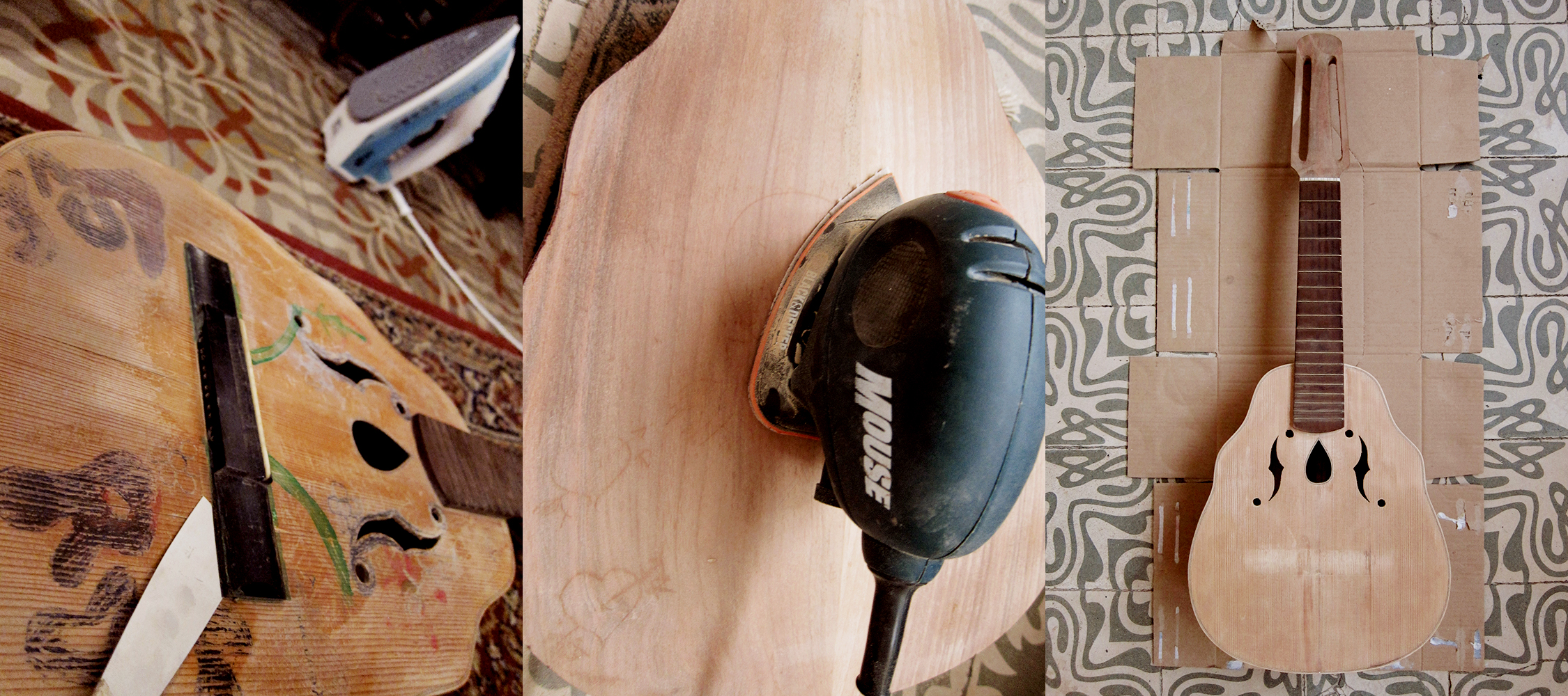 I stripped the laúd completely, took off machine heads, tail piece and bridge. I got the bridge off with a spatula heated on a normal clothes iron, it works like a charm every time. I cleaned and oiled the fretboard and polished the frets. Then I sanded down all the wood with an electric sander, this felt a bit harsh on an instrument but most of the text was actually scratched in to the wood and not painted on so I had to take out the heavy artillery. On top of that, the solid spruce top felt really thick so I thought that the sound might actually benefit from a thinner top. I glued some cracks in the top with my trusty old fish glue and then I waited and waited for the shellac I had ordered from Germany that unfortunately never arrived. I really wanted to use shellac on this instrument, both for practice for myself for future builds and projects, but also for the laúds sake, it felt like the healthiest option. In the end I went and bought normal clear lacquer, or varnish, I’m not really sure what the guy sold me but he said it would work and it did. It applied two coats and sanded lightly in between and it looks ok but I guess if I would have looked even better if I had spent more time on sanding and getting it super smooth in between the coats. I had to paint this at night in poor light and got some drips that should have been taken out properly, I just scraped them off with a razor and then applied new lacquer. I guess I have learnt a few things for the next time. One trick I can share though, that everyone might already know about but anyway. Before I started with the lacquer I marked out where the bridge was going to be and then masked that off with tape so I wouldn’t have to remove the lacquer before I glued the bridge back on and that worked really well.