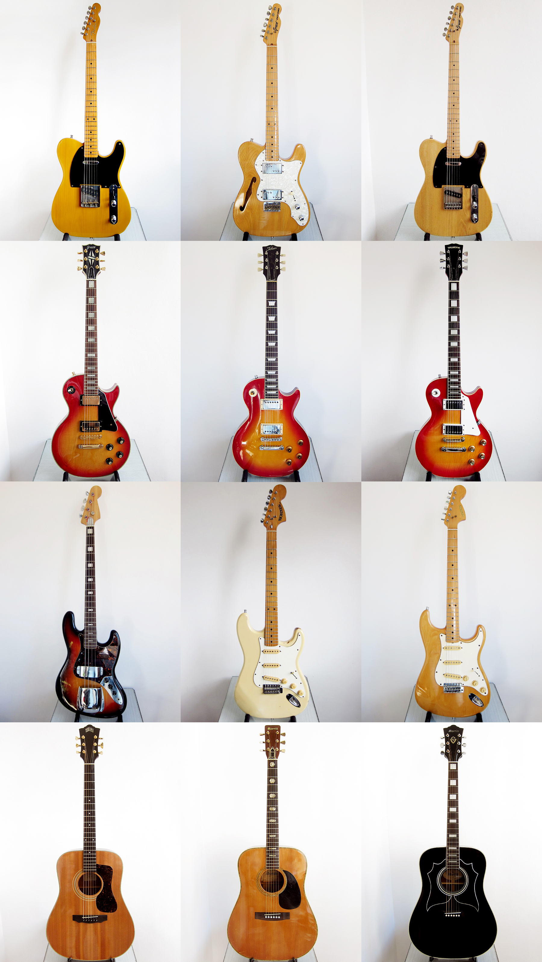I have sold some of my Japanese guitars so this is more or less what’s left, from left to right: Fender Telecaster TL52-75 1987, Greco Spacey Sounds TE-500N 1977, Greco Spacey Sounds TL-500 1979, Greco Les Paul Custom EG-600C 1980, Tokai Love Rock LS-55 1991, Westone Les Paul 1970′s, Jazz Bass 1978, Hohner Stratocaster 1970′s, Westone Stratocaster 1979, K.Yairi TG-40 1977, Morris WL-40 1973, Morris WL-35 1980′s