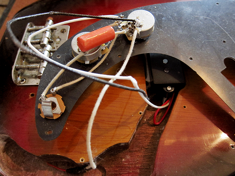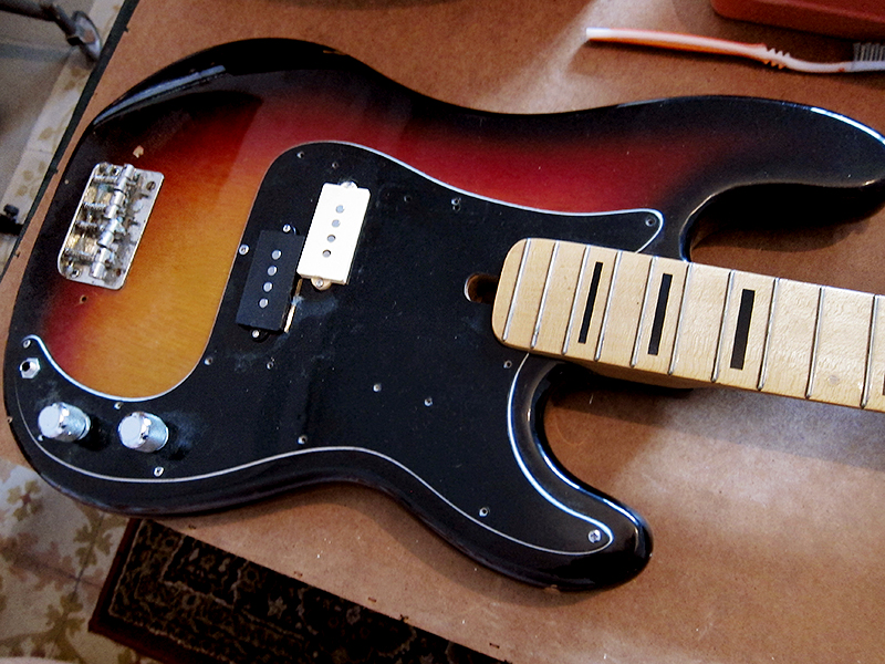 Back in January I bought a really nice Japanese made Precision bass for my friend Dani from South City Music. Well he paid for it but I had to order it since he doesn’t have an eBay account. He is as addicted as I am when it comes to buying instruments online so he doesn’t trust himself with an eBay account, probably for the best. It was pretty beat up but looked really nice in dark sunburst with a maple fretboard. It wasn’t a proper brand it just said Hobbs Music on it, which turned out to be Hobbs Musical store in Lancaster so I assume they imported it in the Seventies from Japan and put their own name on it. Anyway, the bass arrived but Dani wasn’t happy with the pickups so it was put a side for six months and now we ordered a set of Artec Alnico V P-bass pickups and new bridge and pickup covers from Custom world guitar parts. Dani fitted everything but passed the bass over to me to just look it over. He had done a good job, the wiring was correct and the soldering looked good. I did my best to clean it up, adjusted the saddles to get the action down and sorted the intonation. It’s a really heavy and solid bass, good wood for sure and the maple neck is amazing to play on. I plugged it in to check that everything was in order and sat for a half an hour playing bass by myself, something I never do. It felt quite a lot like my Japanese Jazz bass copy from 1978. It’s unbranded too, or rather someone has removed the logo on the headstock so I don’t know what brand it is. I can’t really jump to any conclusions from just two basses but I have a feeling that the Japanese basses are as well made as the guitars, even if it’s and unbranded instrument. I did an earlier post about the quality of Japanese guitars.