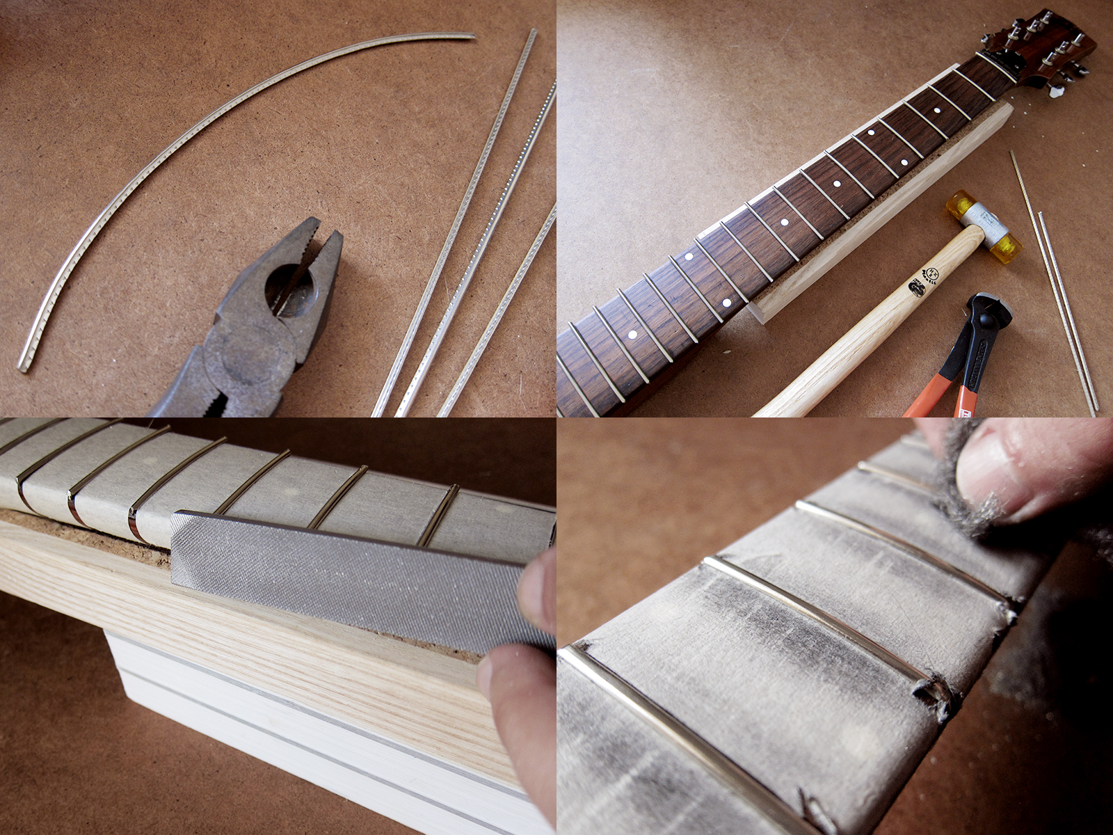 First I checked that the neck was straight with a straight edge and adjusted the trussrod until it was perfect. It was a lot easier to get the old frets out if you cut in a bit on each side with a sharp knife, it gave the pliers something to grip, but be careful so you don’t slip and scratch the fretboard, as I did. I used normal wood glue and then gently tapped the new Jescar FW43080 fretwire in place. When the fret edges were cut I taped the fretboard with masking tape and then filed down the edges, first straight and then angled the file 45°.
